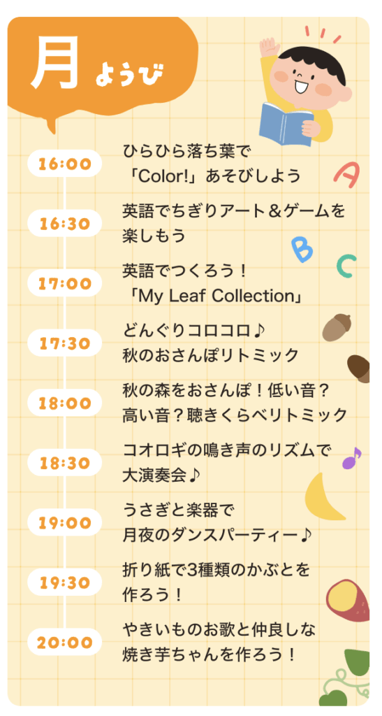 2025年10月末、とある週の月曜日と土曜日のクラススケジュールです!