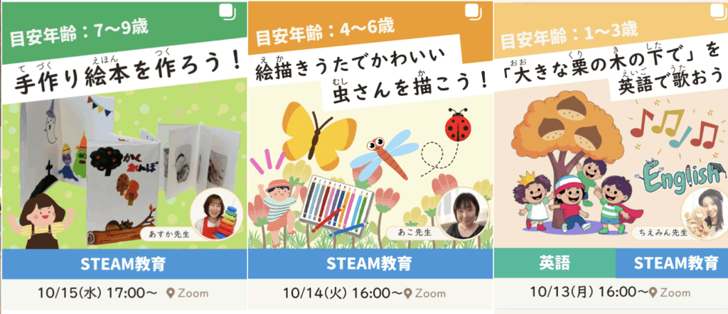 • 材料(折り紙やクレヨンなど)は自宅準備が必要なクラスが多い。