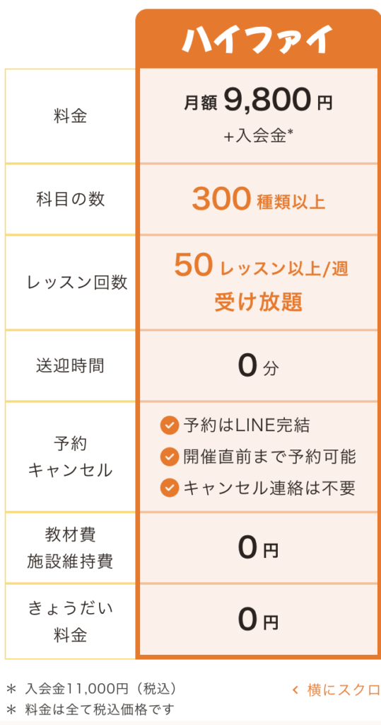 料金月額 9,800円(税込)+入会金11,000円月額 18,000円(税込)+入会金11,000円(例:月謝6,000円×3つ通う場合)